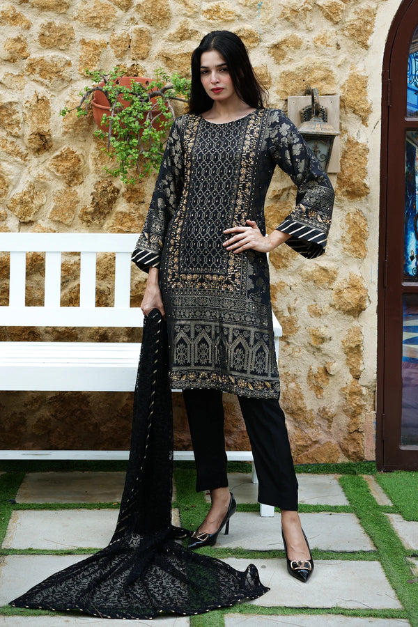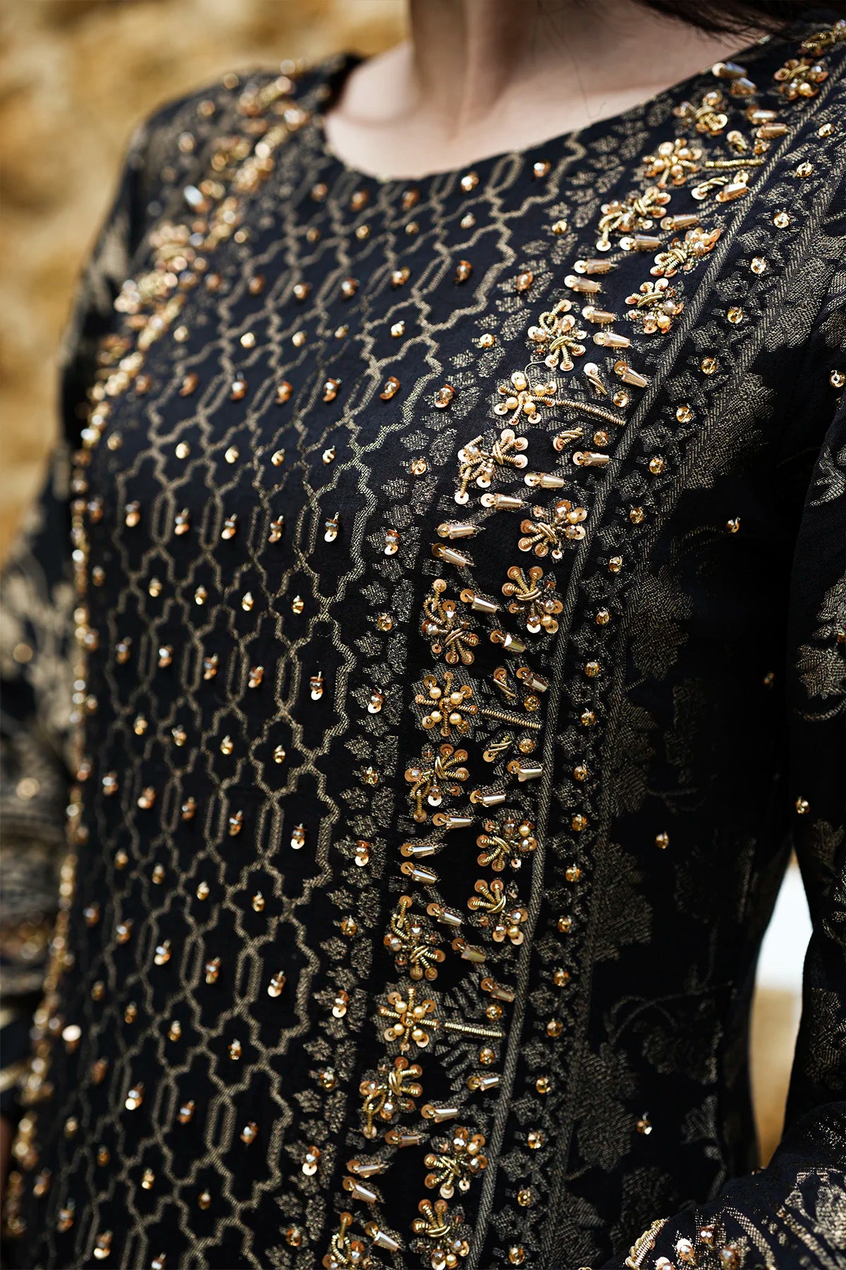 Bold meets tradition in Zehra, a timeless black ensemble crafted to make an impression. The cotton jacquard shirt is enhanced with rich Adda embroidery, offering a play of texture and heritage detailing, while the raw silk trouser provides a structured and polished base.