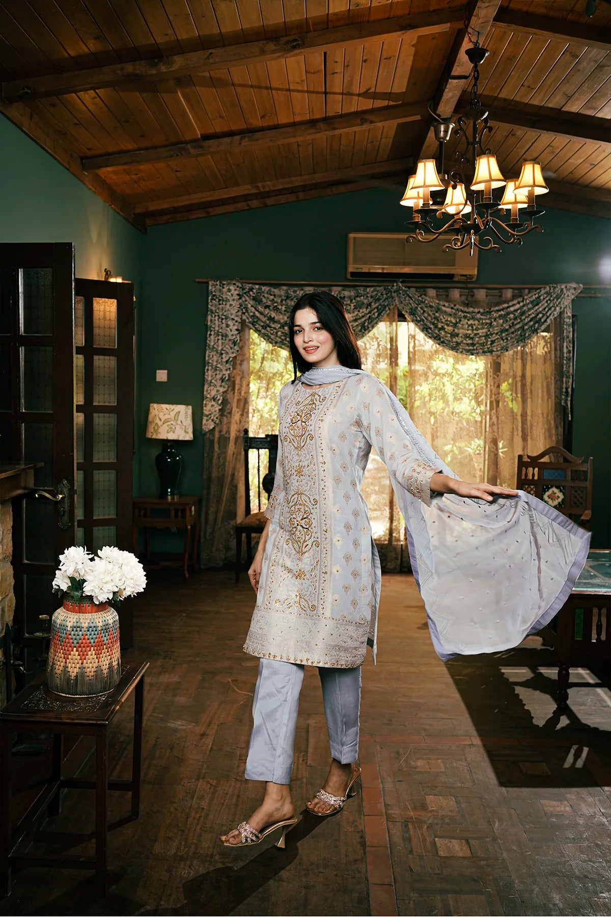 Roshini blends elegance and ease into one beautifully crafted 3-piece ensemble. The soft powder blue cotton jacquard shirt is adorned with traditional Adda work, striking a balance between classic design and seasonal freshness.