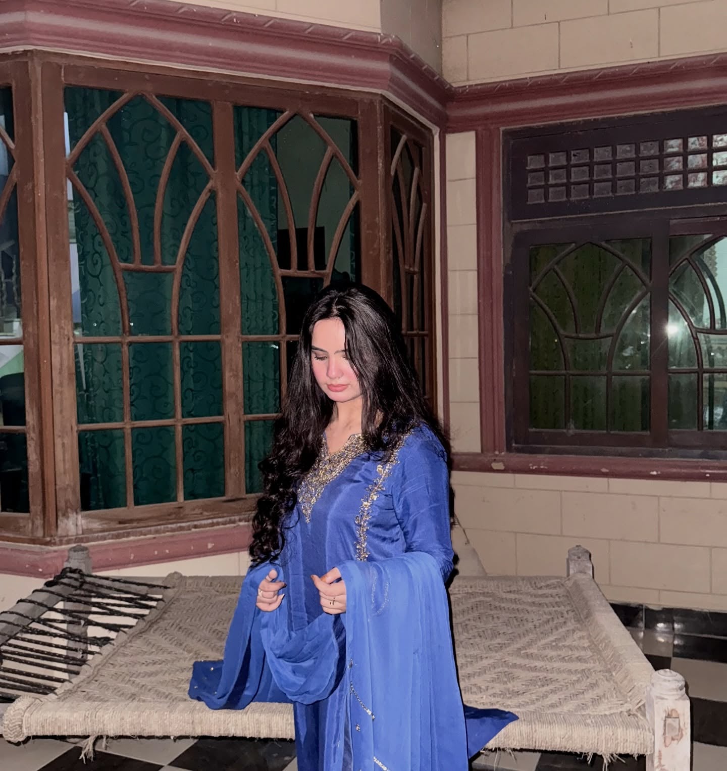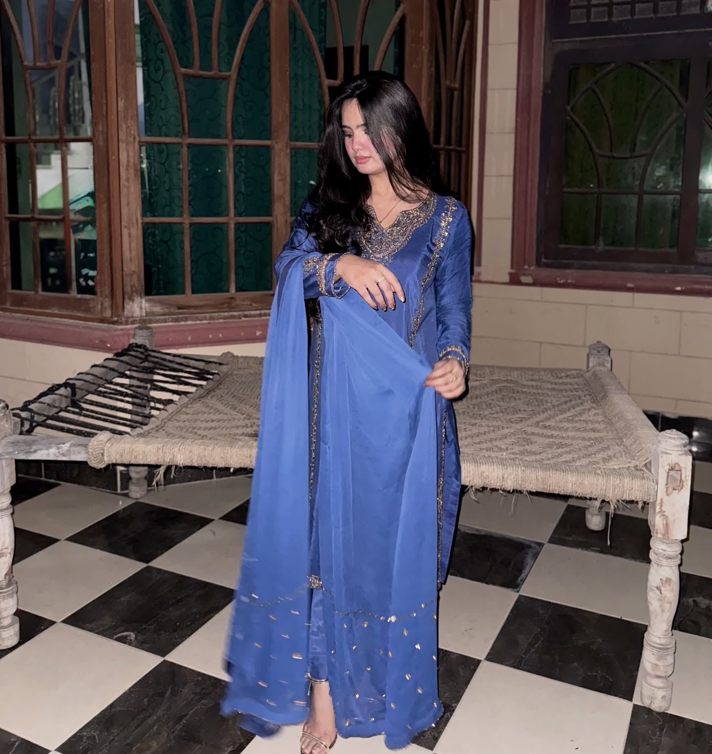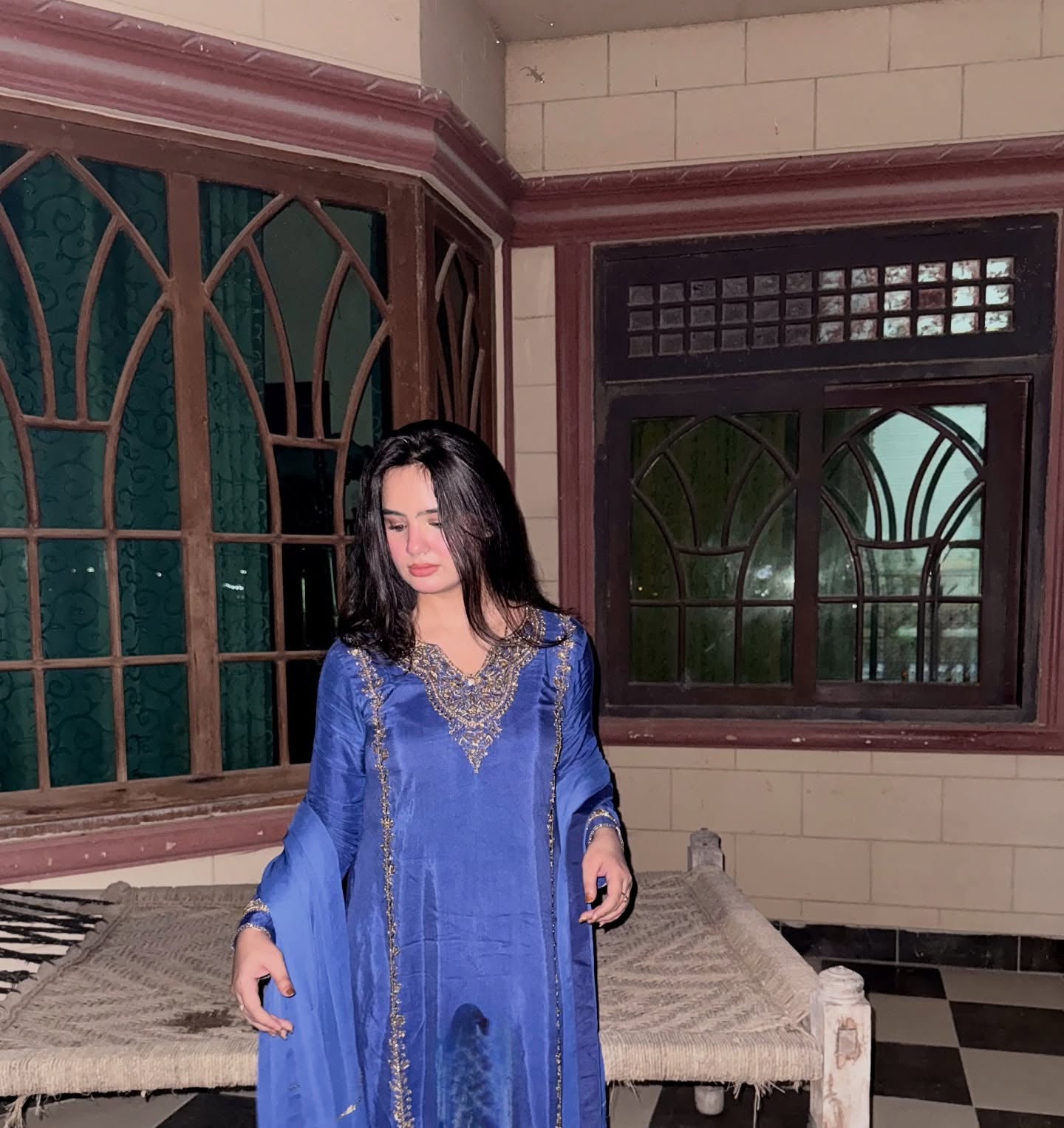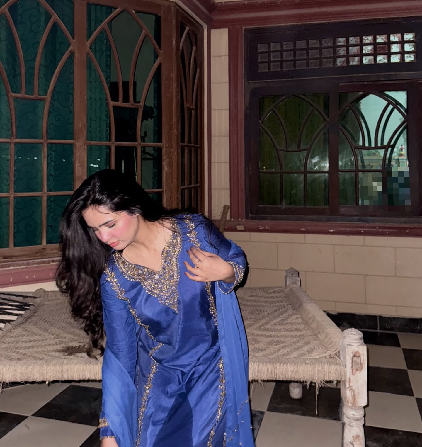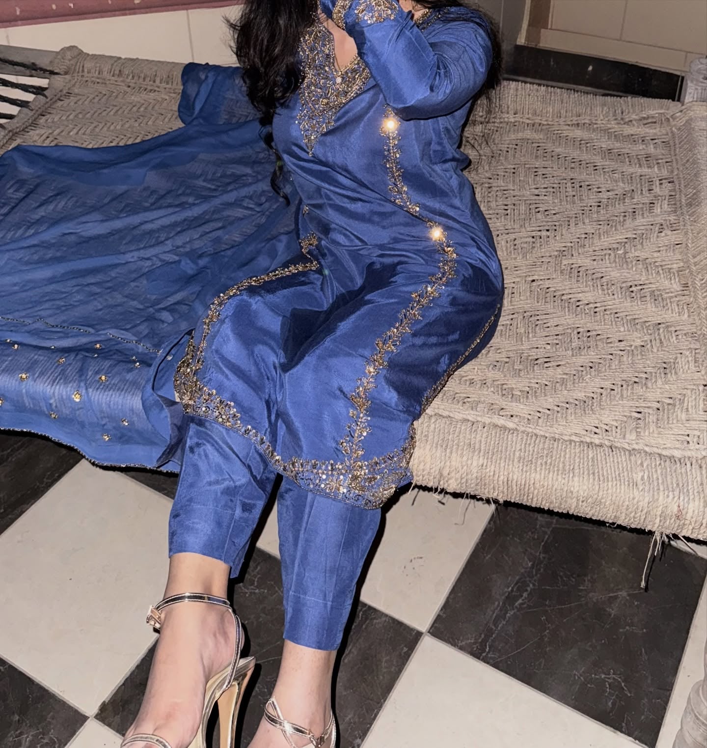 This outfit features fine embroidery and delicate fabrics. Dry clean only to maintain quality. Keep away from direct sunlight and store carefully in a breathable garment bag to ensure long-lasting elegance.