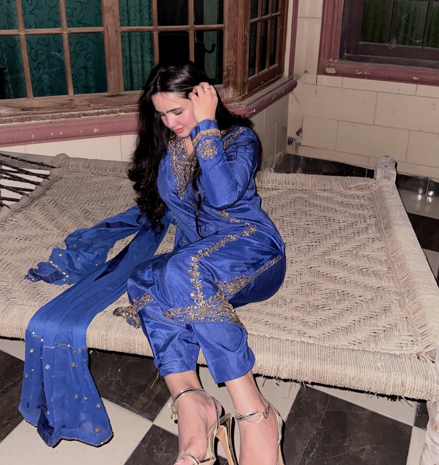 Refresh your festive wardrobe with Azuria, a refined three‑piece ensemble that fuses artisanal detailing with modern grace. The 42‑inch soft oak silk shirt is adorned with intricate antique adda work along the neckline, sleeves, and hem—creating a timeless focal point. Complementing it, the tailored oak silk trousers offer a sleek, comfortable fit, while the lightweight chiffon dupatta, edged and scattered with matching adda detailing, drapes effortlessly for an ethereal finish. Perfect for weddings, formal gatherings, and celebratory events, Azuria balances traditional craftsmanship with contemporary silhouette for a standout look every time.