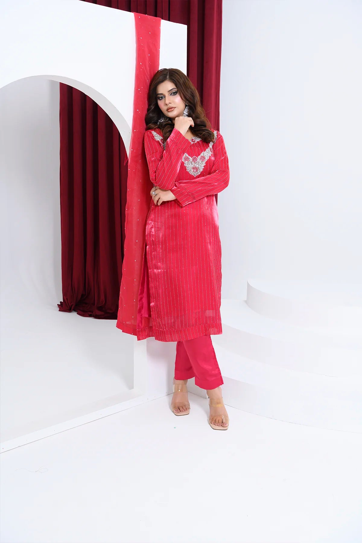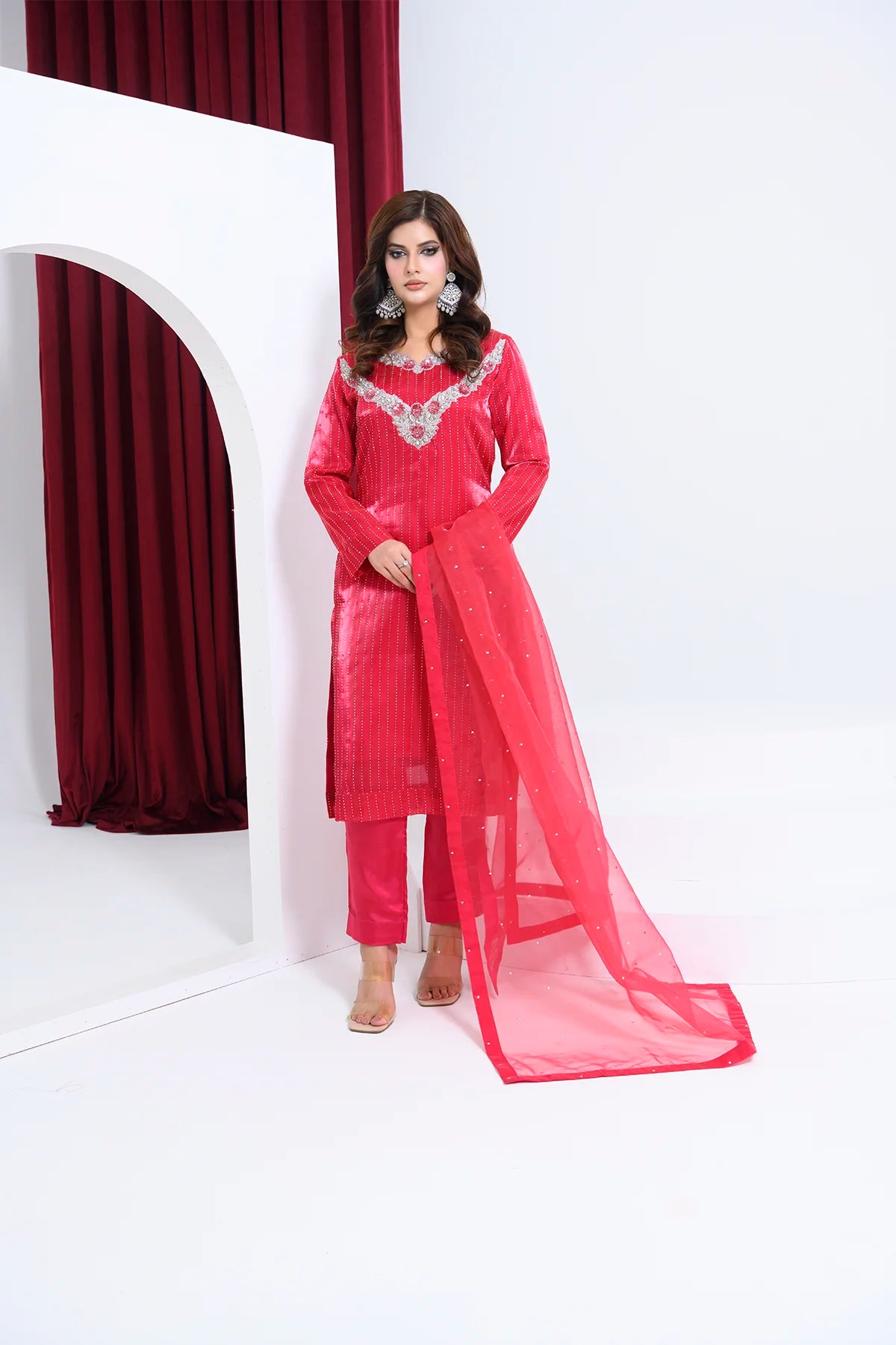 • Silhouette: Tailored straight trousers • Flowing dupatta