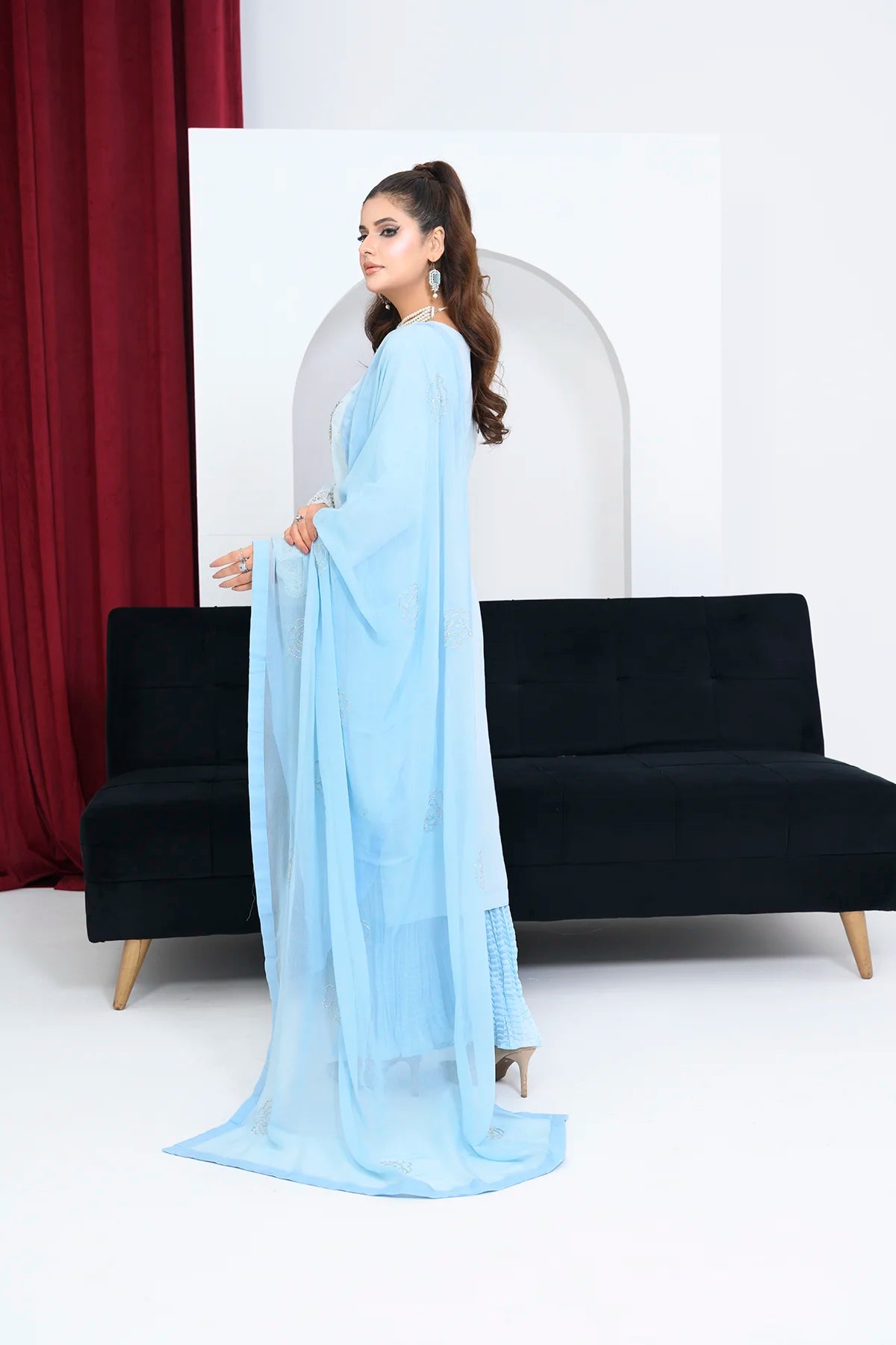 • Fabric: Premium chiffon shirt & dupatta; crushed pleated trousers