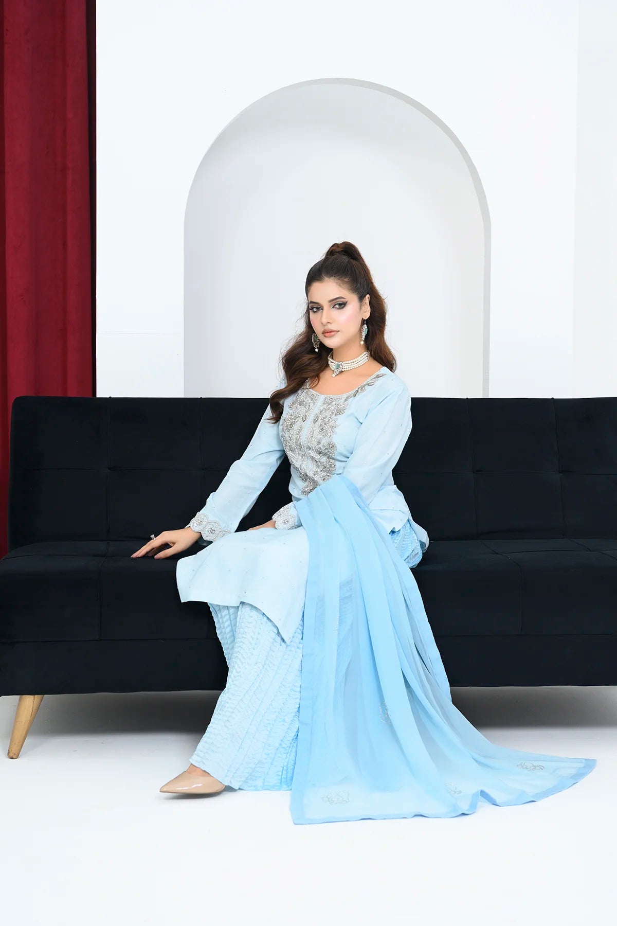 Radiate refined elegance in Luminara, a captivating three‑piece ensemble designed to turn heads at weddings and festive gatherings. The 42″ chiffon shirt is richly embellished with traditional adda work—featuring kora and dabka embroidery—then hand‑studded with lustrous pearls, sequins, and stones for a multidimensional shimmer. Complementing the top, crushed pleated trousers add modern texture and an effortless drape. A matching chiffon dupatta, edged and scattered with coordinating sequin and stone detailing, completes the look with graceful movement. Luminara seamlessly blends artisanal craftsmanship with contemporary styling for a standout celebration outfit.