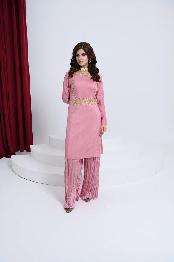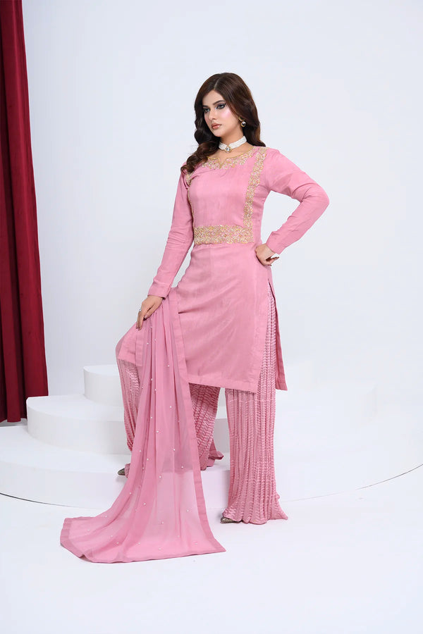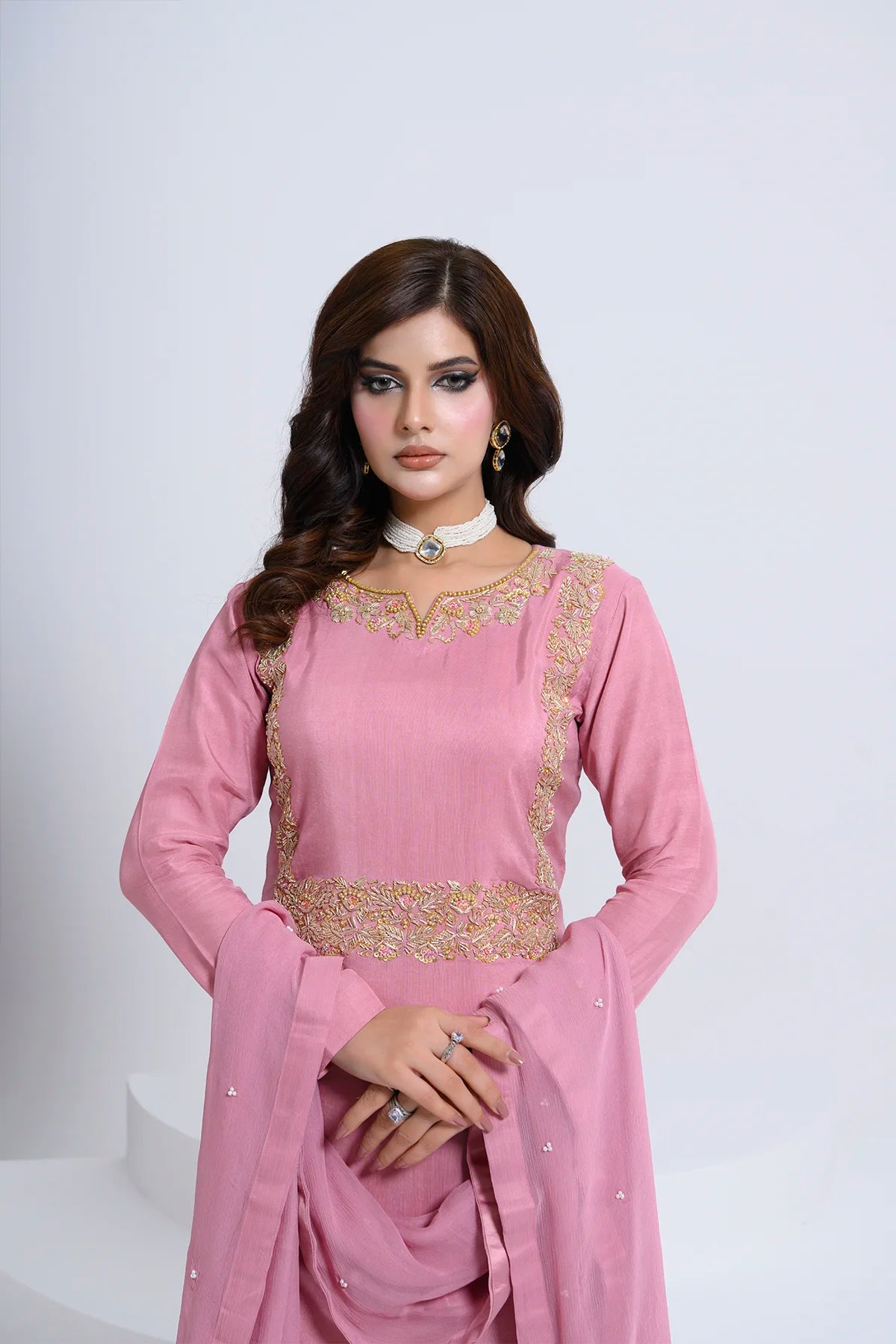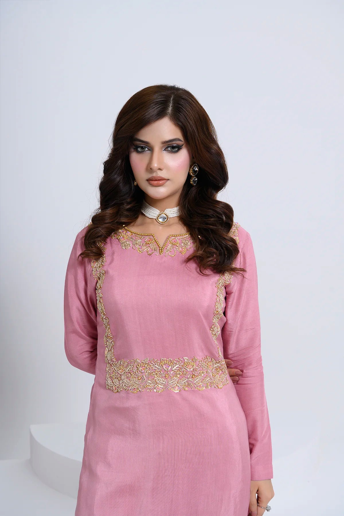 Embrace refined elegance with Rosaline, a meticulously crafted three‑piece ensemble that showcases fine oak silk and heirloom embellishments. The 40″ oak silk shirt features artisanal adda work in kora, dabka, and zardozi—creating an opulent frame around the neckline, cuffs, and hem. Complementing it, the crushed silk trousers offer a textured, flared silhouette for comfort and style. A lightweight crinkle chiffon dupatta completes the set, draping gracefully with subtle movement. Perfect for weddings, festive gatherings, and evening soirées, Rosaline blends traditional craftsmanship with contemporary design for a standout statement.