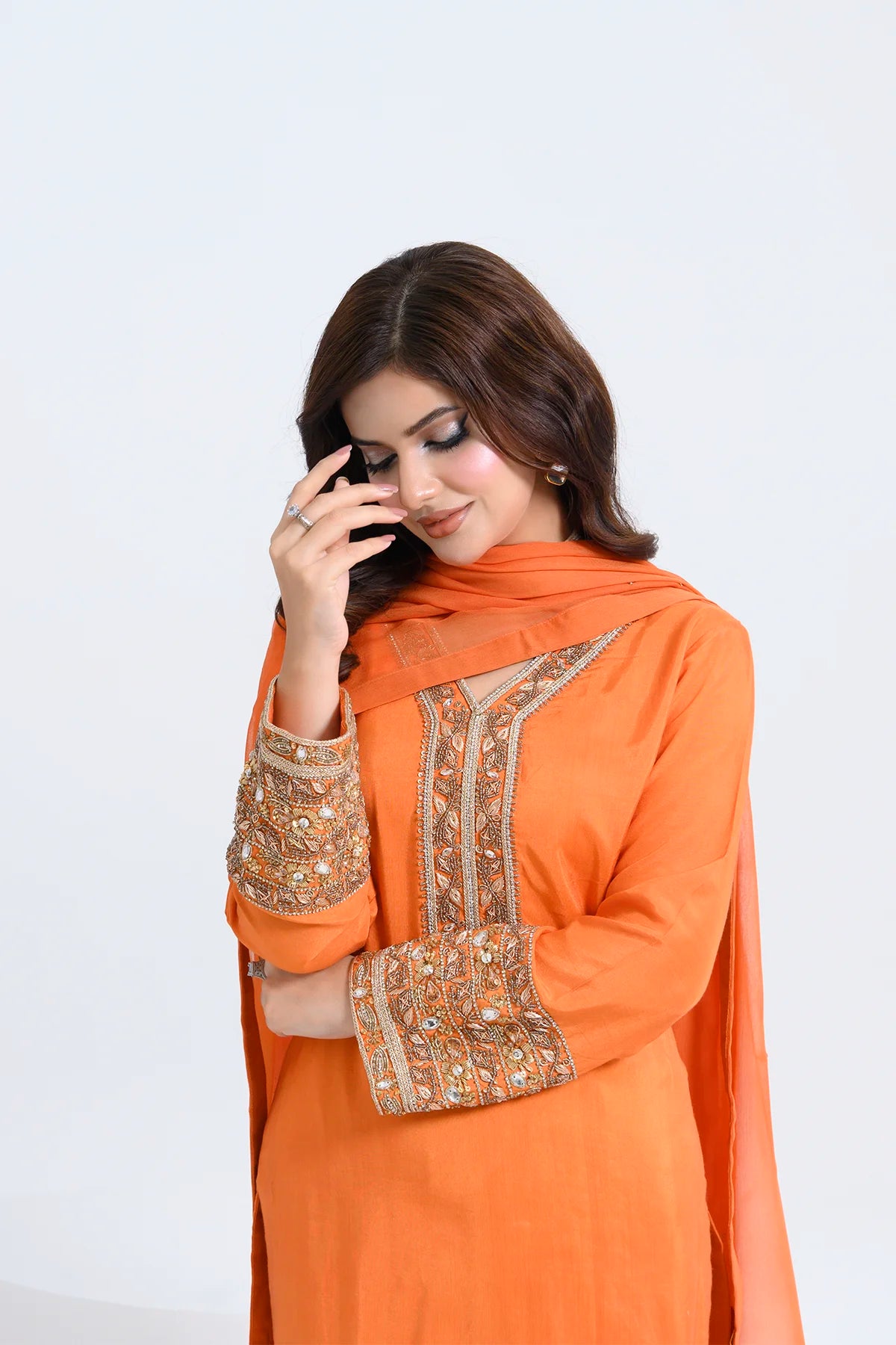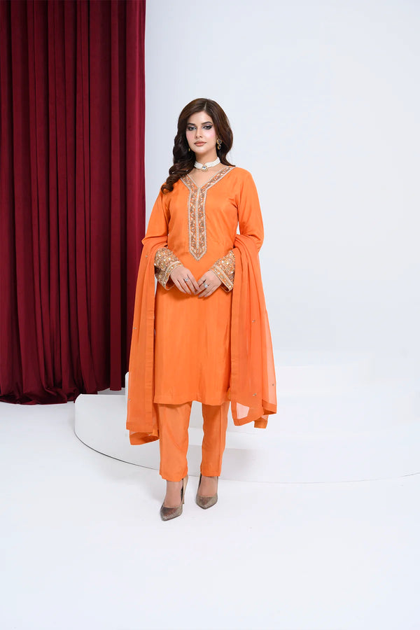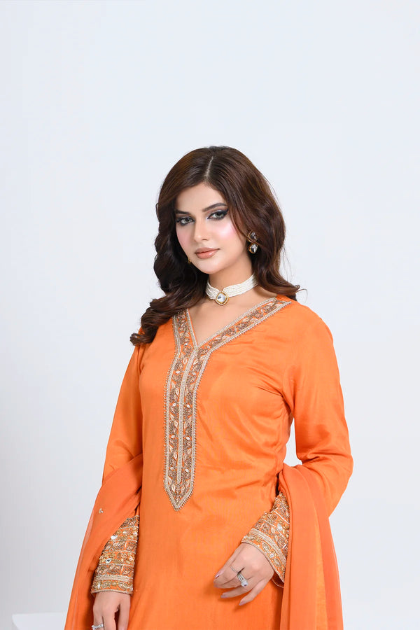 Step into the spotlight with Saffronne, a luxurious three‑piece ensemble crafted from rich oak silk and artful adda work. The 42″ soft oak silk shirt features intricate adda‑stitch detailing along the neckline, sleeves, and hem for a touch of artisanal glamour. Paired with straight‑cut oak silk trousers, this set delivers a sleek, modern silhouette. A lightweight crinkle chiffon dupatta drapes effortlessly, adding subtle texture and fluid movement. Ideal for weddings, festive gatherings, and formal occasions, Saffronne blends traditional craftsmanship with contemporary style—ensuring you stand out in every celebration.